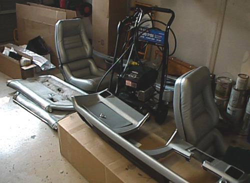 | October 28, 2000. I finished assembling the seats, and decided (with some help from my wife) to move the interior parts out of the dining room and into the garage. Can the body shop paint my car any faster if I stop by the shop every day??? |  |