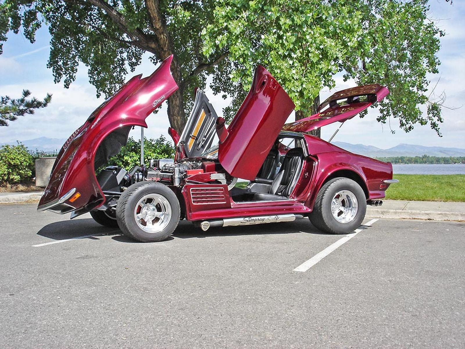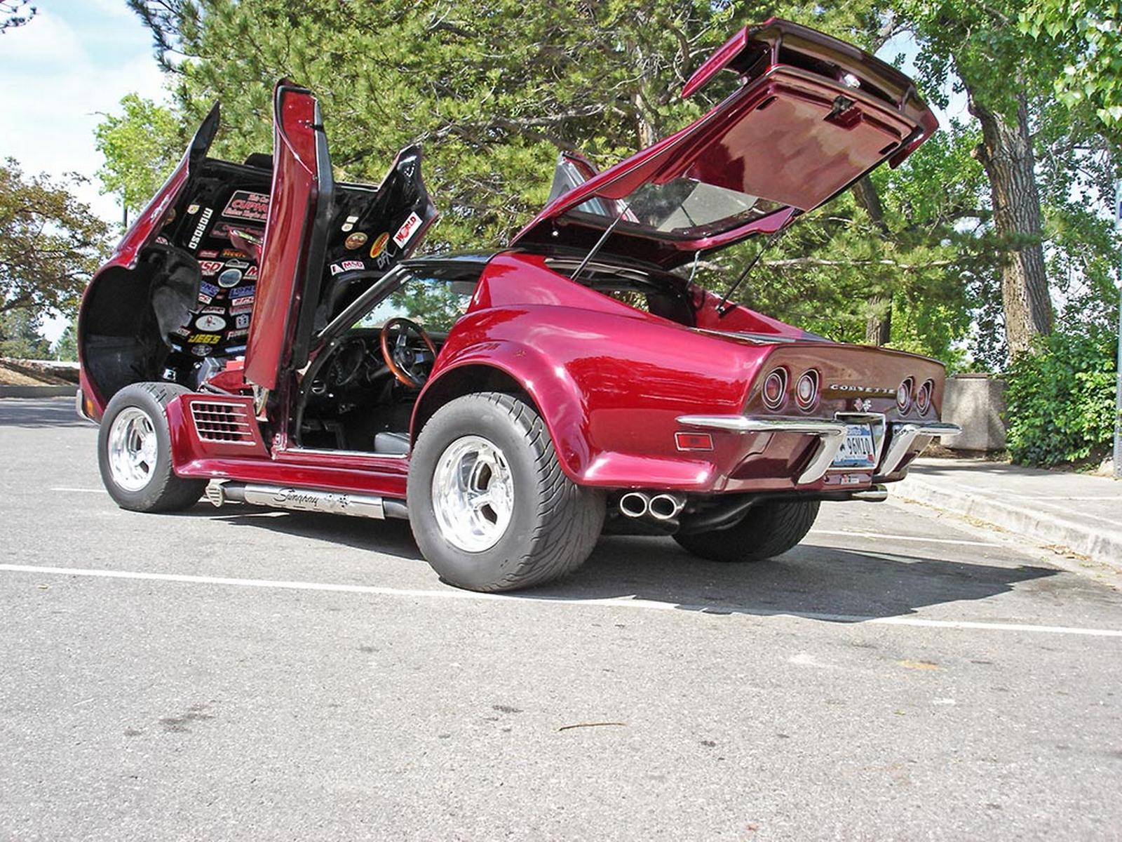 Front clip reinforced and glassed into a single piece tilt front clip, Daytona front fender louvers, door pockets modified to accept Lambo style door hinges, Eckler's ground effects kit and front spoiler modified for the 71 body, rear deck area tubbed out as expanded storage,