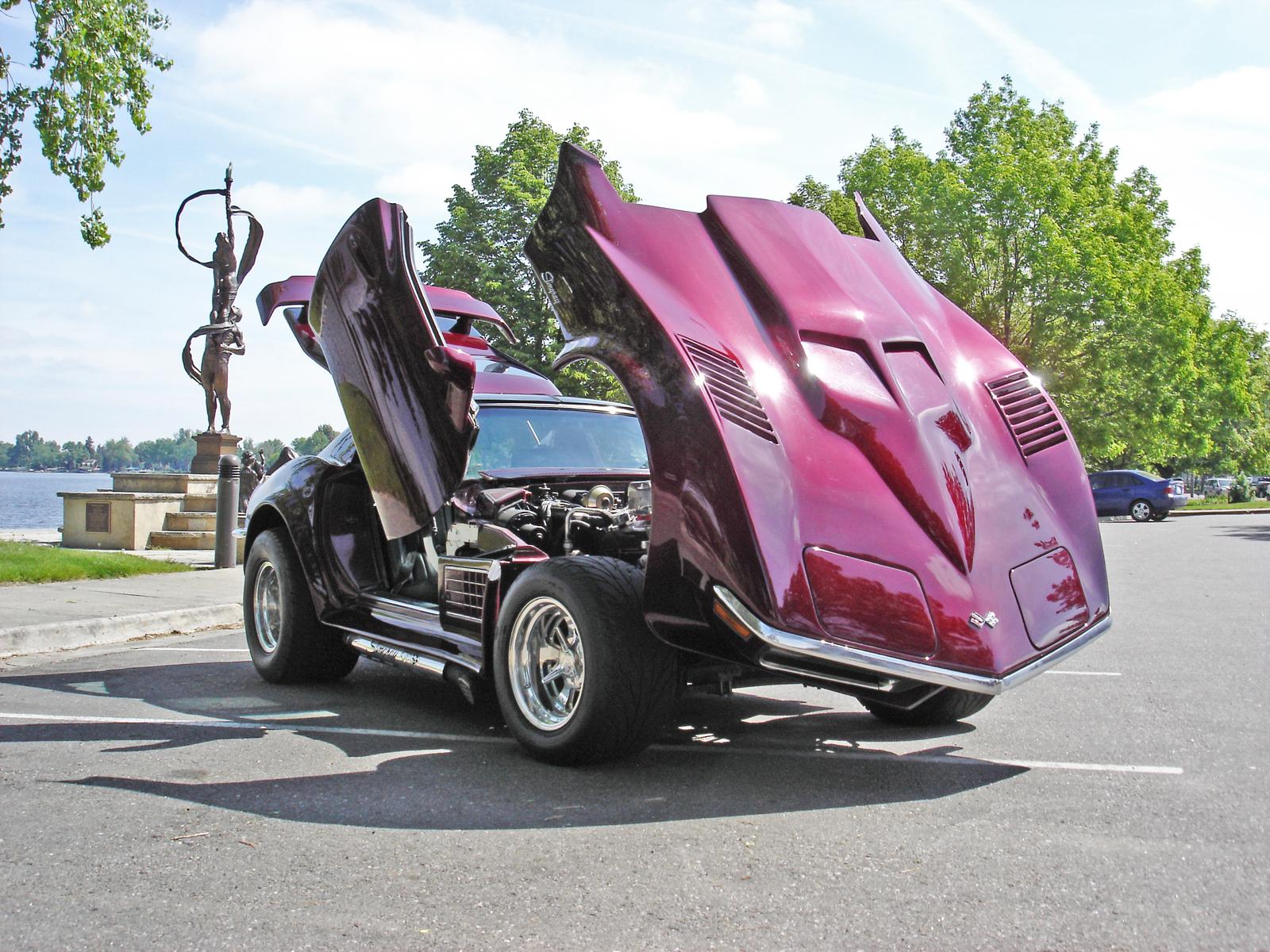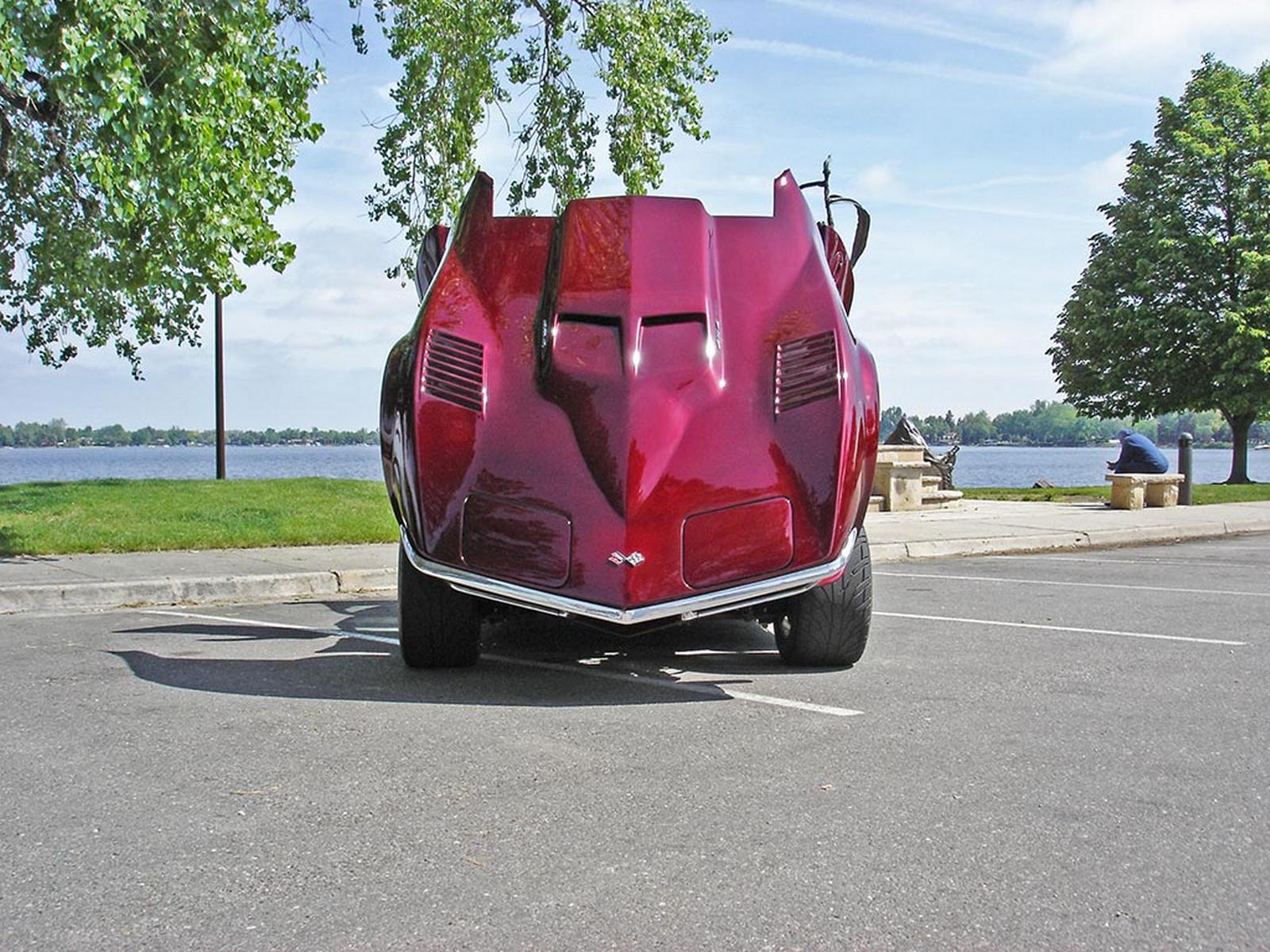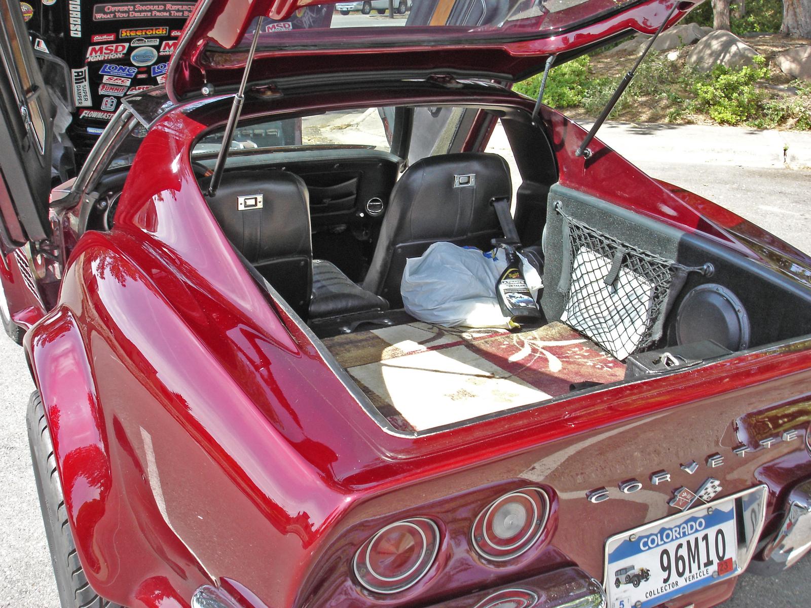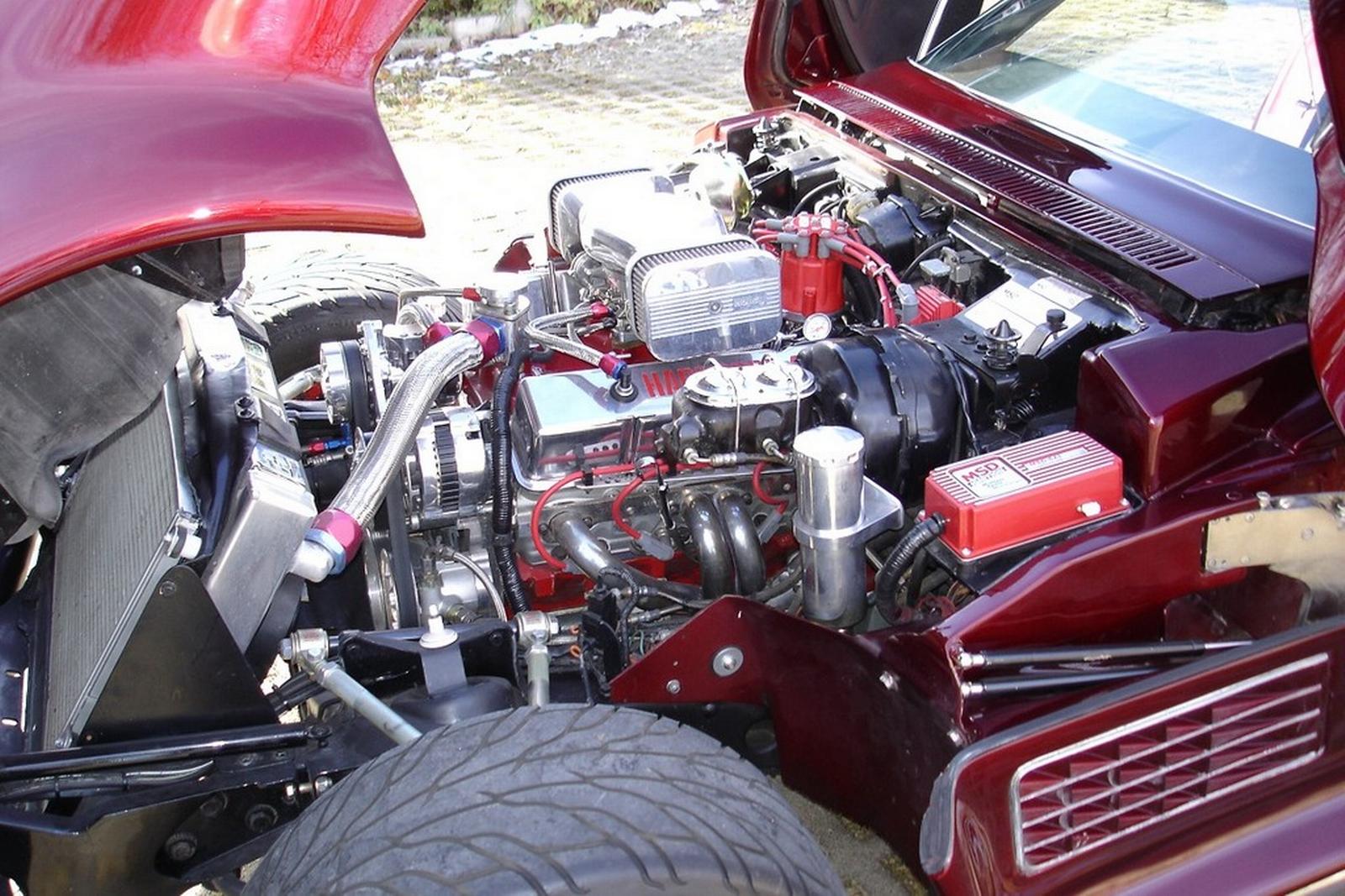 Front clip reinforced and glassed into a single piece tilt front clip, Daytona front fender louvers, door pockets modified to accept Lambo style door hinges, Eckler's ground effects kit and front spoiler modified for the 71 body, rear deck area tubbed out as expanded storage,